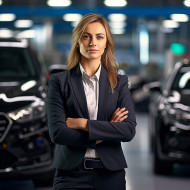 Confident beautiful woman automotive human resources manager at work on blured background