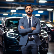 indian man automotive sales representative work blurred background confident handsome car dealership showroom customer smiling professional happy successful confident experienced friendly helpful knowledgeable passionate dedicated reliable trustworthy friendly welcoming approachableImagine Buddy