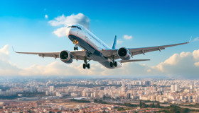 Airplane for transportation flying over the city on beautiful, air transportation stock images, ai prompt air transportation, airplane stock images
