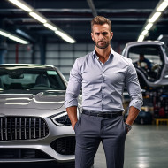 Confident handsome man automotive safety compliance specialist at work on blured background
