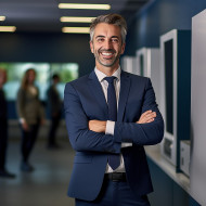 banking finance marketing manager work blurred background male handsome smile friendly banking office professional corporate suit tie laptop computer desk chair phone coffee cup paperwork documents files meeting presentation teamwork collaboration success growth ambition career growth happy confident successful leader motivator inspirationImagine Buddy