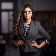 Confident beautiful indian woman banking and finance investment banker at work on blured background