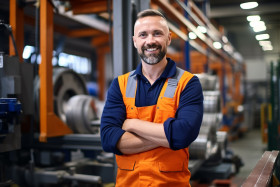 industrial models engineer industry work male portrait smile friendly handsome blurred background factory plant machine equipment production manufacturing safety glasses hard hat uniform vest boots tools blueprint clipboard pencil paper design ideas innovation success career business professional team team player leader motivation inspirationImagine Buddy