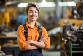 industrial models female woman worker industrial heavy industry factory manufacturing machinery equipment engineer technician hard hat safety glasses vest gloves boots smile friendly happy positive confident empowered successful diversity inclusion representationImagine Buddy