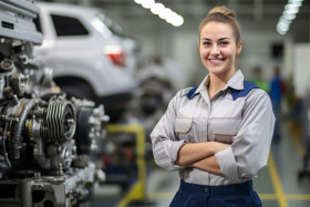 Smiling woman mechanic working on a blurred background