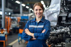 industrial models mechanic woman female beautiful smiling friendly work blurred background auto repair car repair engine repair automotive transportation vehicle tools garage jumpsuit grease oil dirt passionate skilled professional confident determined strong independent empoweringImagine Buddy