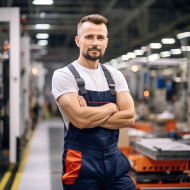 Confident factory worker on assembly line on blured background