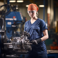 industrial models machinist woman confident work blurred background factory machine engineer manufacturing industrial metal tools lathe drill press sparks safety glasses gloves uniform overalls hardhat boots strong independent skilled capable focused determined professional competent experienced reliable productive efficient successful role model inspirationImagine Buddy