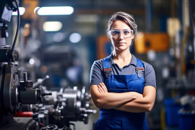 industrial models confident woman machinist work blurred background factory machine industrial hardhat goggles uniform tools metal steel manufacturing production assembly engineer technician labor worker skilled professional power strength empowerment inspiration role model diversity inclusion female success motivation female power girl power career job employment livelihood passionImagine Buddy