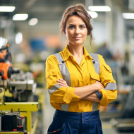 industrial models woman assembly line worker confident blurred background factory manufacturing industry production product quality control employee female empower independent strong success role model motivation inspiration leadership skilledImagine Buddy