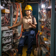 industrial models electrician indian woman confident work blurred background power tools wires circuits safety helmet glasses gloves boots uniform diversity inclusion female empowerment inspiration rolemodel stereotypebreaker career skilled professional business entrepreneur leader strong capable smart intelligent determined motivated passionate successful happy proud satisfied fulfilled confident confident confidentImagine Buddy