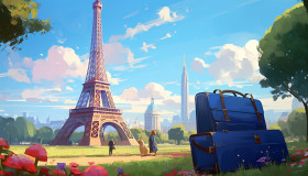 Luggage in the grass, eiffel tower in the background, adventure travel stock images, adventure travel ai prompts, travel stock images ai