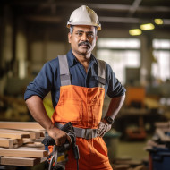 industrial models man carpenter confident indian work blurred background hammer saw wood workshop table tools drill machine safety glasses gloves apron lumber plywood cabinet furniture craft artisan skill professional small business entrepreneur craftsmanship dedication passion creativity innovation success achievement inspiration motivationImagine Buddy