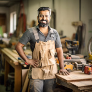 industrial models man carpenter confident indian work blurred background hammer saw wood workshop table tools drill machine safety glasses gloves apron lumber plywood cabinet furniture craft artisan skill professional small business entrepreneur craftsmanship dedication passion creativity innovation success achievement inspiration motivationImagine Buddy