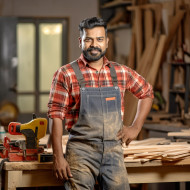 industrial models man carpenter confident indian work blurred background hammer saw wood workshop table tools drill machine safety glasses gloves apron lumber plywood cabinet furniture craft artisan skill professional small business entrepreneur craftsmanship dedication passion creativity innovation success achievement inspiration motivationImagine Buddy
