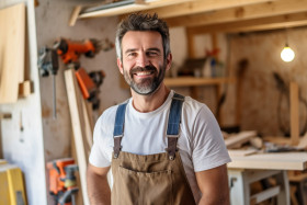 industrial models carpenter man work smile friendly blurred background woodworking tools wood saw hammer nails chisel plane table saw workbench lumber sawdust safety glasses hard hat apron gloves boots skills experience professional craftsmanship quality dedication satisfaction happy smile cheerful positive optimistic friendly approachable inviting trustworthy reliable honest ethical professionalImagine Buddy