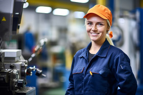 industrial models machinist woman smiling friendly work blurred background factory machine industrial manufacturing metalworking engineer technician safety glasses gloves tools uniform blue collar job career woman empowermentImagine Buddy