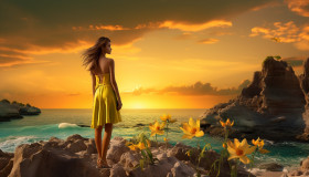 Sunset on rocky beach with thai woman in yellow dress, adventure travel stock images, adventure travel ai prompts, travel stock images ai