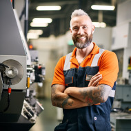industrial models machinist man friendly smiling working blurred background factory machine tools metal workwear uniform safety hat glasses gloves boots lathe drill press mill grinder saw welder brazer fabricator operator assembler manufacturer industrial engineering production quality precision accuracy skill craftsmanship experience expertise professionalImagine Buddy
