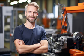 industrial models factory worker machinist smiling friendly work blur background machine metal tool lathe drill metalworking engineering industry manufacturing production automation precision accuracy skill expertise experience professional safety glasses gloves uniform helmetImagine Buddy