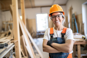 Smiling female carpenter at work on blurred background