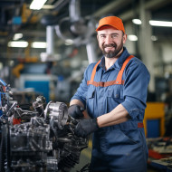 industrial models mechanic friendly smiling man work blurred background garage car engine tools uniform smile happy professional trustworthy reliable honest skilled experienced helpful friendly customer service satisfaction guarantee repair fix diagnose maintain serviceImagine Buddy