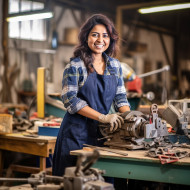 industrial models female indian worker tool and die maker smiling friendly blurred background factory industry manufacturing engineering work tools dies machine metal metalworking precision manufacturing automotive aerospace medical electronics defense construction energyImagine Buddy