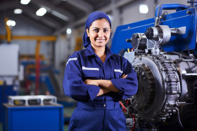 industrial models indian woman machinist worker smiling friendly factory machine metal industrial work job blue collar uniform lathe drill press mill tools safety glasses gloves hardhat apron sparks metalworking manufacturing engineering production industry business commerce india asia culture tradition diversity portrait peopleImagine Buddy