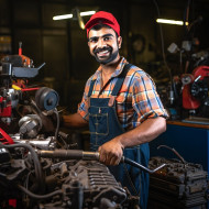 industrial models indian male mechanic friendly smiling working blurred background workshop car engine tools grease uniform overalls cap dirty hands happy satisfied customer service repair fix professional skilled experienced affordable reliable honest trustworthy essential industry workforce occupation business small business local business communityImagine Buddy