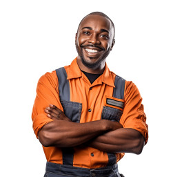 Cheerful mechanic posing against a white background