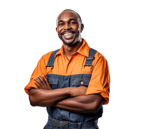 Cheerful mechanic posing against a white background