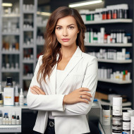 Confident beautiful woman beauty and personal care product sales representative at work on blured background