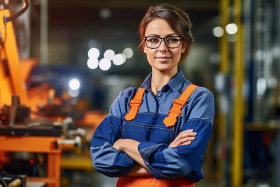 glazier woman confident work blurred background glass window construction repair female tools equipment professional skilled safety hard hat goggles gloves uniform ladder smiling happy success empowerment female empowerment women in construction women in trades role modelImagine Buddy