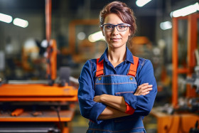 glazier woman confident work blurred background glass window construction repair female tools equipment professional skilled safety hard hat goggles gloves uniform ladder smiling happy success empowerment female empowerment women in construction women in trades role modelImagine Buddy