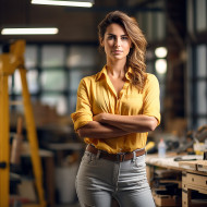 mason woman confident work blurred background construction worker builder hard hat safety vest tools bricks mortar trowel level gloves hammer nails saw drill safety glassesImagine Buddy