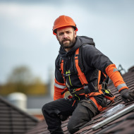 roofer work confident man blur background construction building repair fix roof job ladder hammer nails shingles safety helmet vest harness professional skilled experienced ladder tools belt gloves boots hard hat happy satisfied smile successful pride accomplishment achievement confidenceImagine Buddy