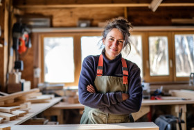 carpenter woman confident work blurred background tools wood hammer saw safety glasses ear protection gloves sawdust workshop construction female carpenter woman carpenter woodworker female woodworker builderImagine Buddy