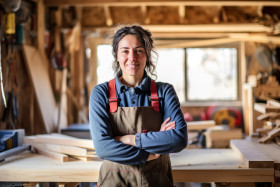 carpenter woman confident work blurred background tools wood hammer saw safety glasses ear protection gloves sawdust workshop construction female carpenter woman carpenter woodworker female woodworker builderImagine Buddy