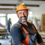 man construction worker smiling happy friendly blue hardhat vest tools building buildingsite work working busy labor bluecollar industry hardwork dedication sweat effort determination teamwork safety protection equipment uniform blurred background focus subject portraitImagine Buddy