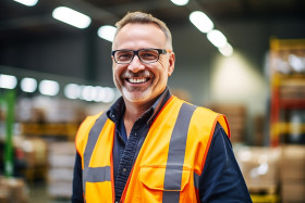 glazier man smiling friendly work blur background glass window cutter installer pane repair maintenance commercial residential home business building office door mirror storefront partition frame sash putty hardware tools equipment safety gloves goggles vest helmet uniform professional skilled experienced reliableImagine Buddy