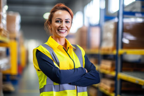 glazier woman work friendly smiling blurred background glass window repair installation maintenance construction tools equipment safety uniform hard hat goggles gloves boots ladder scaffold professionalism dedication expertise experience satisfaction quality customer serviceImagine Buddy