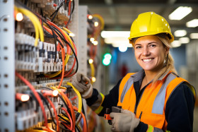 electrician woman friendly smiling work blurred background female professional job trade tools wires circuits safety power electricity light energy repair install maintain service education career empowerment diversity inclusion inspiration rolemodel motivation success confidence happinessImagine Buddy