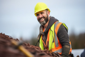 roofer man happy friendly smiling work blur background roof house repair construction hammer nails ladder safety harness helmet gloves boots uniform tools equipment professional skilled experienced reliable affordableImagine Buddy