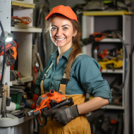 plumber woman smiling friendly blurred background worker working female trade occupation tools wrench toolbox uniform pipe faucet sink toilet repair fix service professional skilled reliable honest trustworthy affordable licensed insured bonded localImagine Buddy