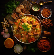 biryani food rice spicy delicious indian cuisine meal dish lunch dinner traditional fragrant basmati chicken lamb beef vegetarian tasty aromatic flavorful festive celebration festivity gourmet recipe cooked saffron curried herbs spices hot steamy yummy mouthwatering served platter authentic homemade takeout illustration imaginebuddy buddyImagine Buddy