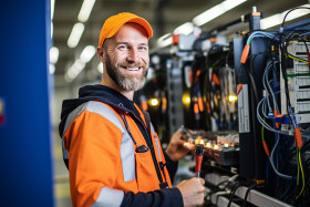 electrician friendly smiling happy working blurred background work smile man job tools skills power electricity wires circuits panel box safety helmet glasses gloves uniform professional customer service repair install maintain upgrade business trade essentialImagine Buddy