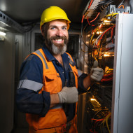 electrician friendly smiling man work blurred background happy professional service customer repair install fix wire circuit breaker outlet switch light power tools ladder tool belt screwdriver wrench pliers testerImagine Buddy