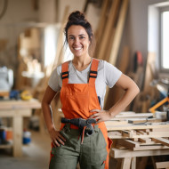 carpenter woman friendly smiling work blurred background tools wood saw hammer nails ruler safety glasses apron gloves workshop construction female skilled professional job career trade creative hardworking passionate happy positive motivated successful empowered role modelImagine Buddy
