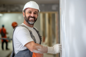 drywall contractor man smiling friendly work blurred background construction building renovation home improvement remodeling handyman professional service skilled reliable trustworthy experienced licensedImagine Buddy