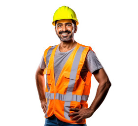 indian man construction worker friendly smiling hardhat vest tools belt white background isolated happy positive cheerful confident professional skilled tradesman laborer employee occupation job career industry construction site buildingImagine Buddy